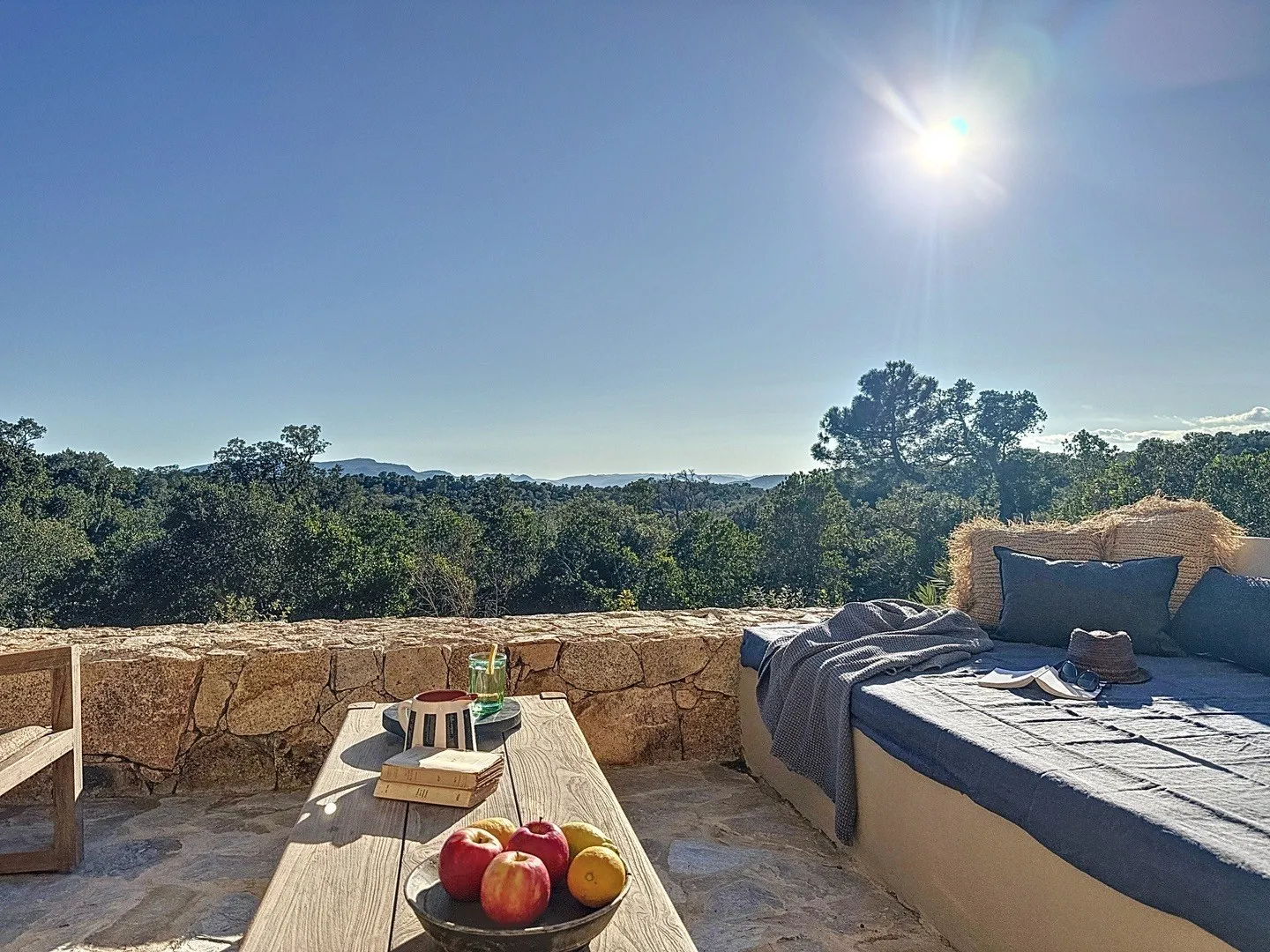 À l’extérieur, vue sur le maquis et la baie de Porto-Vecchio au loin :