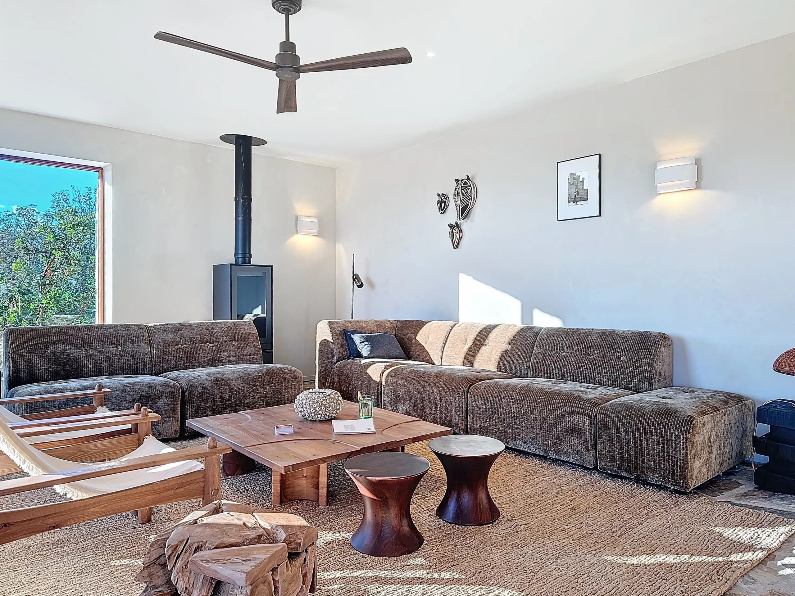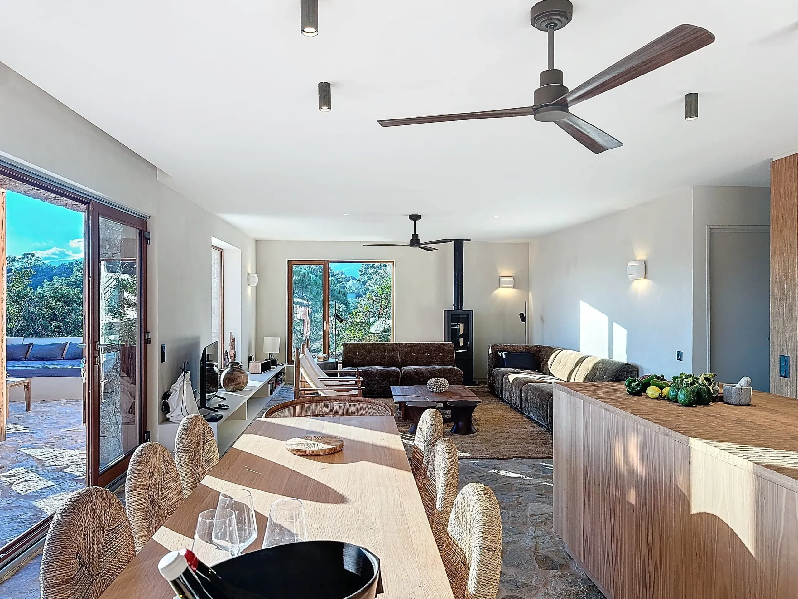– Une pièce de vie avec un grand salon confortable et de nombreuses assises, smart TV, base pour la musique, livres, jeux ; une grande table intérieure et une baie vitrée qui s’ouvre intégralement pour l’accès à la terrasse et sur la nature environnante. Dans cette pièce, vous trouverez deux ventilateurs pour la circulation de l’air et chasser les moustiques si besoin.