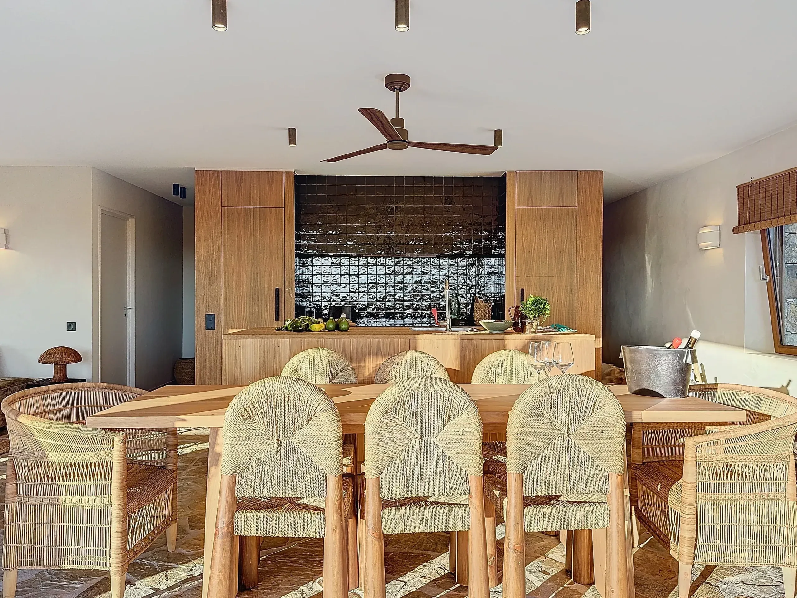 – Une grande terrasse en pierre avec une table de 3m30 pour accueillir les grandes tablées, une pergola et son ventilateur, une cuisine extérieure avec barbecue.